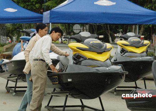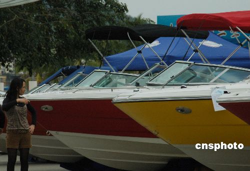 2月8日,游人在三亞鹿回頭廣場參觀豪華游艇。由三亞順業(yè)船舶設備有限公司和香港游艇廠商聯(lián)合舉辦的2008迎春游艇展覽會繼續(xù)在海南三亞鹿回頭廣場舉行,這是三亞首次舉行的大規(guī)模游艇展,展覽將持續(xù)到2月14日。所展出的圣斯克、夢特威、斯莎等品牌的豪華游艇、摩托艇、快艇以及加拿大龐巴迪品牌旗下的快艇、雪地車、沙灘車等海上運動休閑娛樂產(chǎn)品,春節(jié)期間吸引諸多三亞市民和游客參觀。中新社發(fā) 尹海明 攝