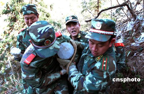 2月13日(農(nóng)歷年初七),麗水市武警支隊官兵在搬運水泥電線桿。浙江麗水市云和縣安溪畬族鄉(xiāng)東岱村在海拔700米以上,在今年遭遇的雪災(zāi)中,電力線路中斷了20余天。當(dāng)天麗水市武警支隊60多名官兵經(jīng)過3天奮戰(zhàn),在冰雪地搬運了36根水泥電線桿,幫助電力職工搶修線路。中新社發(fā) 歷記攝 攝