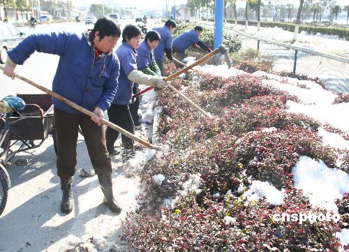 圖:宜興綠化工人清理積雪護(hù)苗木