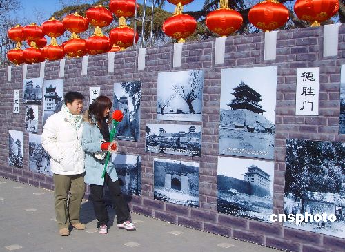 2月13日,北京龍?zhí)逗䦶R會舉辦的最后一天,園中展出的老城門照片吸引了眾多市民的目光。中新社發(fā) 玉龍 攝