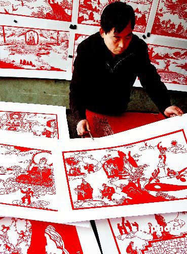2月14日,河南鄭州高新區(qū)石佛村農(nóng)民黃建軍展示自己歷時4年制作的、總長約160米的《西游記》巨幅連環(huán)畫,并準(zhǔn)備將其獻(xiàn)給2008年奧運(yùn)會。據(jù)了解,該連環(huán)畫由210張畫組成,故事取材于西游記原著,每個章節(jié)最多用7到8張來表現(xiàn),從2003年開始創(chuàng)作,耗時約4年,僅起稿就花費(fèi)近1年半時間,每張要“剪”兩三天的時間。中新社發(fā) 馬健 攝