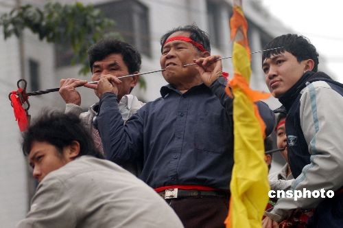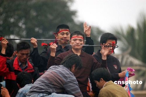 2008年2月16日,瓊海市,祈求五谷豐登,風(fēng)調(diào)雨順!败娖隆笔呛D厦耖g的一個傳統(tǒng)節(jié)日,相傳源于唐代,為紀念六世紀我國嶺南著名俚人首領(lǐng)冼夫人而舉行的祭祀活動,距今已有1300多年歷史。獨特的民俗風(fēng)情吸引了大批游客。中新社發(fā) 蒙鐘德 攝