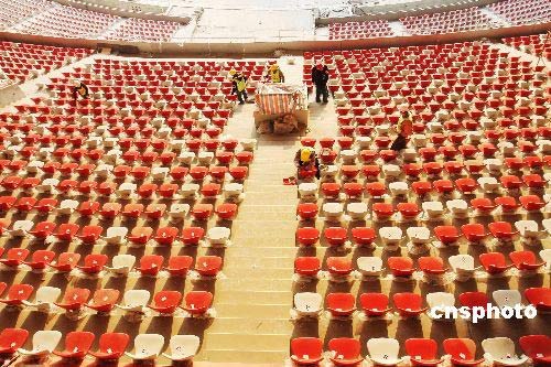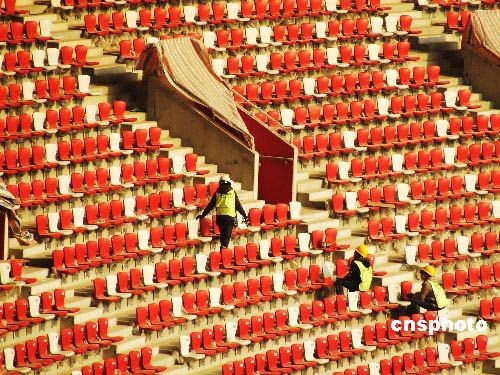 2月18日,工人們正在國家體育場“鳥巢”內(nèi)清潔座椅。北京2008年奧運會主會場——國家體育場“鳥巢”8萬個固定座椅已于1月底安裝完工,這意味著北京國家體育場“鳥巢”的建設(shè)工程已接近尾聲。中新社發(fā) 鄭雄增 攝