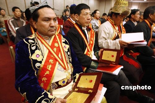 2月28日,由中國文化部主辦的國家級非物質(zhì)文化遺產(chǎn)項目代表性傳承人頒證儀式在人民大會堂舉行。88位來自各省、自治區(qū)、直轄市的第二批國家級非物質(zhì)文化遺產(chǎn)項目代表性傳承人代表出席了儀式。這次公布的第二批國家級非物質(zhì)文化遺產(chǎn)項目代表性傳承人共551名,包括了民間音樂、民間舞蹈、傳統(tǒng)戲劇、曲藝、民俗等五大類。傳承人頒證儀式的舉辦能夠讓更多的人認識中國非物質(zhì)文化遺產(chǎn)的價值,從而進一步推進非物質(zhì)文化遺產(chǎn)保護工作。中新社發(fā) 杜洋 攝