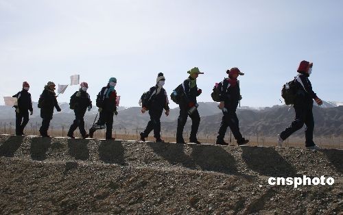 2月28日,新疆哈密伊吾縣八名農(nóng)牧民婦女從302省道50公里處走過。2月27日,新疆哈密伊吾縣八名農(nóng)牧民婦女為慶三八、迎接奧運自發(fā)組織徒步行走208公里,此次活動將用八天時間走完全程。她們的行動受到了沿途農(nóng)牧民的支持和好評。中新社發(fā) 普拉提 攝