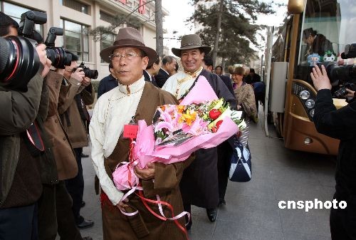 3月2日,出席十一屆全國人大一次會議的西藏代表團抵達(dá)駐地北京京西賓館,受到熱烈歡迎。前者為新雜·單增曲折代表(西藏自治區(qū)人大副主任),后者是多吉次珠代表(拉薩市市長)。中新社發(fā) 任晨鳴 攝