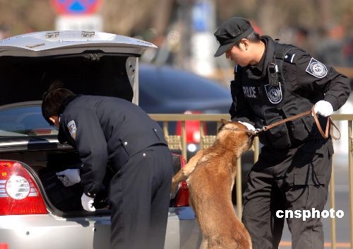 三月三日,安檢人員牽著警犬對所有進入天安門廣場的車輛進行安全檢查。當日下午,全國政協(xié)十一屆一次會議在北京人民大會堂隆重開幕。中新社發(fā) 王東明 攝