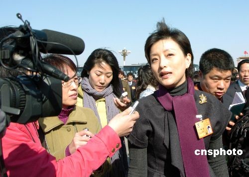 圖為政協(xié)委員楊瀾接受記者采訪。3月3日下午,中國人民政治協(xié)商會議第十一屆全國委員會第一次會議在北京人民大會堂開幕。委員們積極參政議政、獻言獻策,進出人民大會堂時被中外記者團團圍堵。中新社發(fā) 毛昭勝 攝