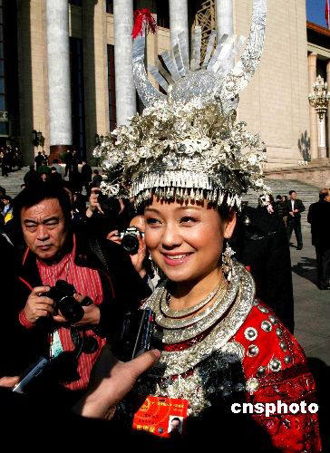3月4日上午,十一屆全國(guó)人大一次會(huì)議舉行預(yù)備會(huì),來(lái)自貴州黔東南地區(qū)的苗族姑娘雷阿幼朵備受記者關(guān)注。 中新社發(fā) 王輝 攝