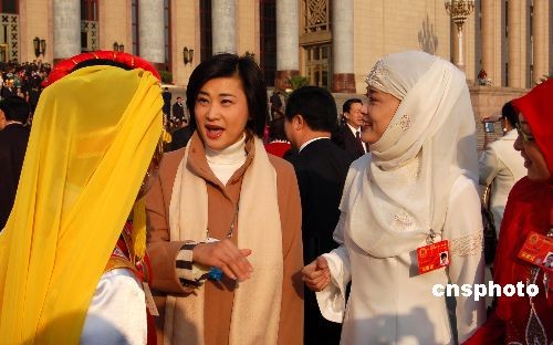 3月5日,十一屆全國(guó)人大一次會(huì)議在北京人民大會(huì)堂開幕。香港鳳凰衛(wèi)視名主播吳小莉(左二),會(huì)前在大會(huì)堂前采訪少數(shù)民族代表。中新社發(fā) 劉萬(wàn)強(qiáng) 攝