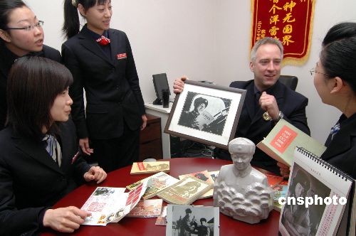 3月5日,“洋雷鋒”羅杰斯在“外國(guó)人學(xué)雷鋒我們?cè)趺崔k?”活動(dòng)中展示自己收藏品。遼寧省錦州市商業(yè)銀行凌云支行外籍員工、美國(guó)人羅杰斯不但崇拜雷鋒,而且對(duì)學(xué)雷鋒情有獨(dú)鐘,收藏?cái)?shù)百件有關(guān)雷鋒的物品,而且翻譯了雷鋒日記。他在工作、生活中堅(jiān)持用雷鋒精神要求自已,做了很多有意義的事,為弘揚(yáng)傳承雷鋒精神寫了大量文章,羅杰斯說(shuō)雷鋒精神是一種超越國(guó)界、超越時(shí)空、超越意識(shí)形態(tài)的精神。中新社發(fā) 李鐵成 攝