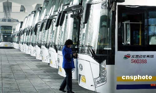 3月8日,北京首批采用“京劇臉譜”造型的50部新型環(huán)保雙層公交車亮相三環(huán)路,它們將在本月10日替換下特8路內(nèi)環(huán)原有的舊雙層車,改善交通環(huán)境服務(wù)奧運。“新雙層”車身長12.6米,滿載量達100人,使用歐IV柴油發(fā)動機。首批50輛新車主色調(diào)呈銀灰色,下個月還將有13輛新車上路。中新社發(fā) 鄭雄增 攝