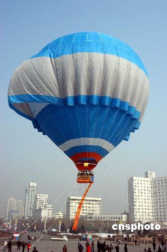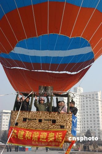 3月12日,黑龍江省牡丹江市航空協(xié)會舉辦的迎奧運熱氣球升空活動在江濱廣場舉行。一只體積達8000立方米、載荷2.2噸、亞洲最大的熱氣球在廣場升起,“共建和諧奧運”的條幅代表了航空愛好者的心聲。此次活動吸引了許多市民前來觀看。中新社發(fā) 張克非 攝