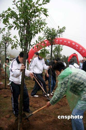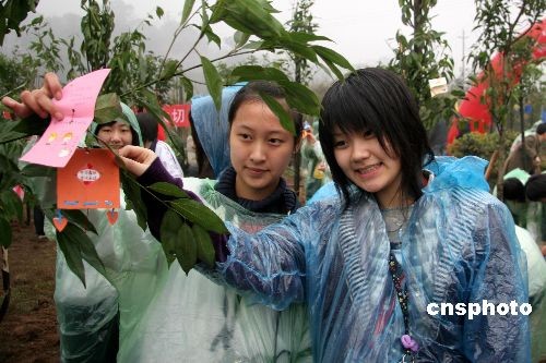 三月十二日是中國一年一度的植樹節(jié),正在重慶交流訪問的日本石川縣、滋賀縣、愛知縣高中生代表團(tuán)冒著濛濛細(xì)雨來到重慶永川,與永川中學(xué)高中生共同植下象征中日關(guān)系長遠(yuǎn)發(fā)展的友誼之樹,并一道在剛剛植下的樹枝上掛上各自精心制作、寫著不同祝福的彩色卡片。中新社發(fā) 孫自法 攝