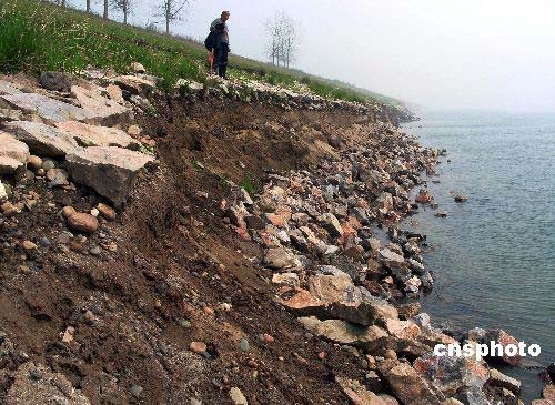 2008年3月18日,枝江市白洋鎮(zhèn)向家壩沙灣堤外垸,崩塌的長江堤防。據(jù)悉,自3月10日以來,湖北枝江市白洋鎮(zhèn)向家壩沙灣堤外垸長江堤防連續(xù)發(fā)生崩塌。該處垸堤長1750米,崩長360米,崩坎平均高1.5米至3.5米,最高處達5米;垸內(nèi)有14戶人家,耕地183畝。據(jù)專家分析,該堤段崩岸主要原因是:一、清水下泄,崩岸處正處清江河口對岸,迎流頂沖,護坡腳槽形成吊坎后崩垮;二、長江近年處在中低水位運行,護坡處淤沙沖失后未及時維護。目前,枝江正在組織勞力、機械、石源對該段進行突擊整治,力爭汛前全面脫險。中新社發(fā) 劉君鳳 攝