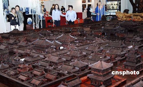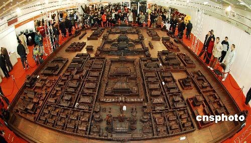 3月20日,為期5天的“第六屆全國工藝品、旅游品、禮品博覽會暨第十一屆春季(大連)中國古玩藝術(shù)品博覽會”在大連星海會展中心舉行。在展會西廳區(qū),一個一展現(xiàn)古都風貌喜迎2008年奧運會為創(chuàng)作宗旨的按正式比例縮小120倍的紫檀巨雕故宮全景,吸引了眾多市民的眼球。這個作品9米長,寬7米,總面積60余平方米,由50余位高級技師歷時6年精心雕制而成。該作品無論從用料、耗時都令人稱絕。如此大型紫檀木雕藝術(shù)作品也實屬罕見。中新社發(fā) 劉德斌 攝