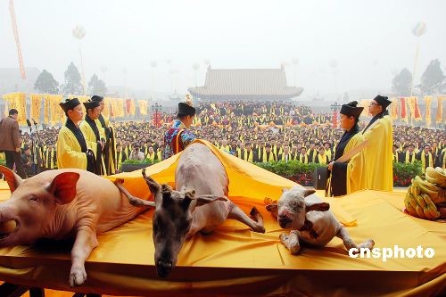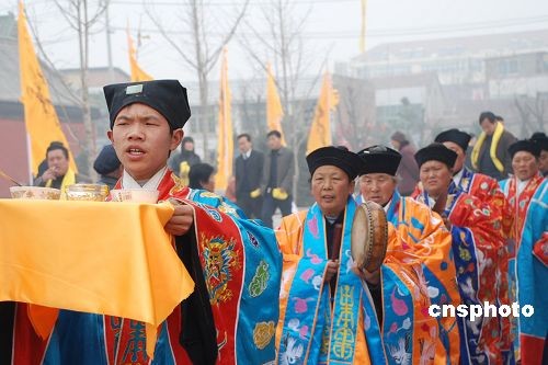三月二十二日,在老子故里河南省鹿邑縣明道宮玄元殿前,當地政府舉行盛大的公祭大典。當日,(農歷二月十五日)中國偉大的思想家、哲學家、道家學派創(chuàng)始人老子誕辰二千五百七十九周年。中新社發(fā) 李志全 攝