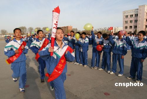 3月24日,為慶祝北京奧運圣火在希臘采集,新疆哈密市六中舉辦了“傳遞火炬 點燃激情”為主題的體驗奧運火炬?zhèn)鬟f活動,千余名學生參加了體驗傳遞奧運火炬活動。中新社發(fā) 普拉提 攝