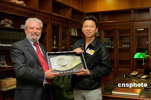 圖為張朝陽(yáng)(右)代表奧運(yùn)官網(wǎng)報(bào)道團(tuán)贈(zèng)送奧林匹亞市市長(zhǎng)喬治· 安東尼斯鳥巢模型。