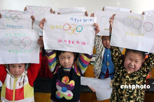 4月7日,邢臺(tái)博文幼兒園的小朋友展示自己畫的奧運(yùn)標(biāo)志。今年以來,該園讓孩子們學(xué)習(xí)奧運(yùn)、社會(huì)和家庭禮儀,訓(xùn)練他們?cè)谌粘I钪械奈拿鲉柡、待客等良好?xí)慣,教育孩子們爭做禮儀小使者,文明奧運(yùn)宣傳員。 陳雷 攝