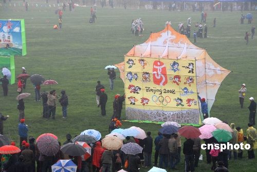 4月21日,綿綿春雨將山東濰坊浮煙山風箏放飛場描繪的更加艷麗,在 “喜迎2008北京奧運”萬人風箏放飛暨第四屆世界風箏錦標賽、中外運動風箏邀請賽現(xiàn)場,五彩斑斕的風箏與花花綠綠的雨傘相映成趣,構(gòu)成了一幅絕妙的春日風情畫。作者: 王曉光