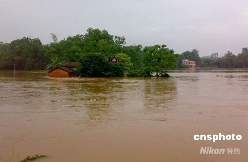 五月四日,廣西部分沿海城市突降暴雨,大雨滂沱數(shù)小時(shí),降雨量竟達(dá)全年平均降雨量的五分之一,造成部分地區(qū)出現(xiàn)水澇。圖為廣西北海市合浦縣白沙鎮(zhèn)五里牌村被洪水淹沒的房屋。中新社發(fā) 羅毅強(qiáng) 攝