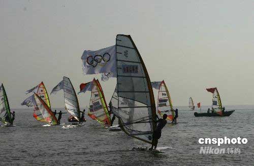 5月6日上午8時(shí)10分,北京奧運(yùn)圣火在海南省?谑袀鬟f,為海南省奪得首枚全運(yùn)會(huì)金牌的女子帆板運(yùn)動(dòng)員王麗芳傳遞第一棒火炬。圖為?谖骱0逗I戏尻(duì)掛滿奧運(yùn)五環(huán)旗祝賀奧運(yùn)圣火在?趥鬟f。中新社發(fā) 尹海明 攝