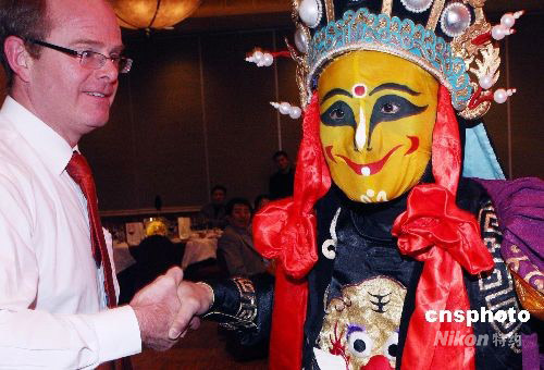 5月6日晚,在北京舉行的中外商貿(mào)合作項(xiàng)目洽談酒會上,來自四川的著名變臉?biāo)嚾藶榧钨e現(xiàn)場進(jìn)行精彩的“變臉”,表演受到在座外國賓客的熱烈歡迎。中新社發(fā) 錢興強(qiáng) 攝