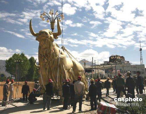 5月7日,位于拉薩市北京中路的被譽為拉薩古城市標的銅雕“牦!,因布達拉宮周邊環(huán)境整治的需要,搬離原處,落戶旁邊的休閑公園。這對重達數(shù)噸的銅牛,是“老西藏精神”的象征,見證了西藏和諧穩(wěn)定和快速發(fā)展。圖為銅牛落戶新址。中新社發(fā) 賈長飛 攝