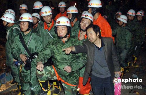 四川汶川縣5月12日發(fā)生7.8級(jí)地震后,北川縣北川中學(xué)受到極大的迫害,將近三千名的學(xué)生中僅有一半學(xué)生生存,另一部分學(xué)生因樓房倒塌而遇難或受傷?拐鹣狸(duì)員不顧艱險(xiǎn)連續(xù)工作,利用不同工具挖掘被壓人員,并及時(shí)成功搶救出一批學(xué)員。圖為綿陽(yáng)一位建筑設(shè)計(jì)人員輔助施工人員進(jìn)行搶險(xiǎn)救災(zāi)。中新社發(fā) 鄒憲 攝