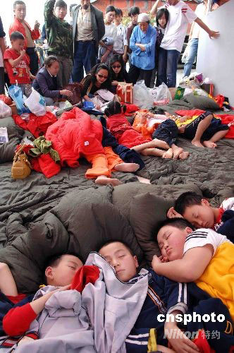 5月15日,從四川綿陽北川羌族自治縣等災區(qū)救出的地震災民被安置在成都九洲體育館救助站救助,高峰期該救助站曾有三萬余名災民聚集。中新社發(fā) 陳文 攝