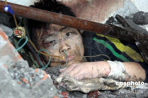 受災嚴重的四川省北川縣北川中學校舍全部倒塌,圖為5月13日拍攝的廢墟中的幸存學生。中新社發(fā) 張雷 攝