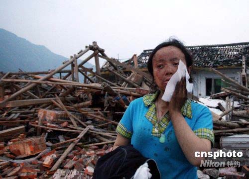 圖:四川地震山民艱難步行逃出山區(qū)