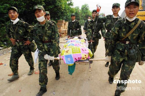 5月16日晨,解放軍某部官兵在地震重災(zāi)區(qū)北川縣茅壩小學(xué)搜救出三名幸存小學(xué)生。中新社發(fā) 陳文 攝