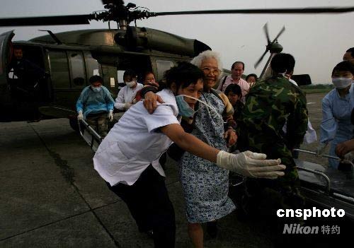 五月十六日下午,二十六名境外游客從汶川大地震被稱為“孤島”的茂縣登上救援的中國空軍黑鷹直升機,平安撤到四川省會成都。這批來九寨溝旅游的二十三位馬來西亞華人女性團隊中,歲數(shù)最大的游客已經(jīng)九十歲。同機還有兩位巴西華人母女游客和一位加拿大男青年,她們被困在地震災區(qū)已經(jīng)四天。中新社發(fā) 賈國榮 攝