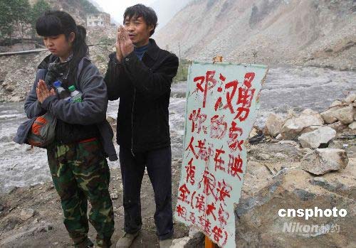 5月17日上午,在四川省汶川大地震中幸存的49歲映秀鎮(zhèn)頭道村農(nóng)民鄧云祥和女兒鄧小琴,在通往家鄉(xiāng)的必經(jīng)之地插上告示牌,企望失蹤的兒子鄧漢勇能夠平安歸來。鄧云祥的家鄉(xiāng)在映秀鎮(zhèn)通往臥龍大熊貓保護(hù)區(qū)的303國道8公里處,至今這條通往臥龍的道路幾乎全線被山體滑坡所覆蓋。中新社發(fā) 任晨鳴 攝