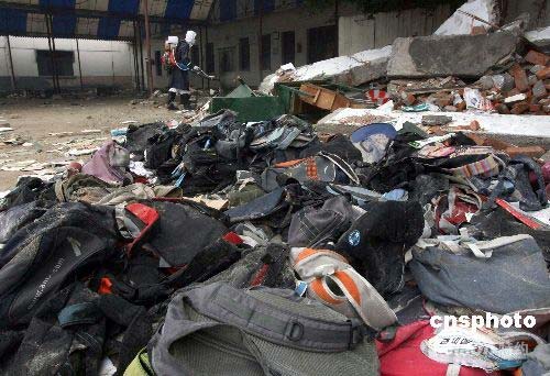 五月十七日,在汶川大地震中垮塌的灌縣聚源中學(xué)廢墟奪取了五十多位師生的寶貴生命,疾病控制人員今天開(kāi)始對(duì)殘留的學(xué)生書(shū)包噴灑消毒藥。中新社發(fā) 賈國(guó)榮 攝