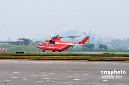 5月17日中午,一架航班號(hào)為FD7802的M26多用途重型直升機(jī)經(jīng)停重慶機(jī)場一小時(shí)后,飛赴四川災(zāi)區(qū)執(zhí)行救援任務(wù)。據(jù)介紹,M26多用途重型直升機(jī)是目前世界上最大的直升機(jī),其機(jī)身長約40米、機(jī)高11.6米、旋翼長32米,空機(jī)約重28噸,最大起飛權(quán)重達(dá)到56噸,最多可容納100余人,是實(shí)施救援的主戰(zhàn)直升機(jī)。自四川汶川地震發(fā)生后,毗鄰四川的重慶機(jī)場共保障抗震救災(zāi)飛行共85架次。中新社發(fā) 肖漢飛 攝