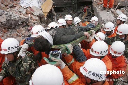 5月17日18時(shí)18分,四川省什邡市鎣華鎮(zhèn)鎣華實(shí)業(yè)有限公司31歲女工卞剛芬在震后本廠綜合大樓廢墟下被埋124小時(shí)后,經(jīng)河南消防搶險(xiǎn)救援突擊隊(duì)連續(xù)31小時(shí)的艱苦營(yíng)救后奇跡生還,她意識(shí)清醒,對(duì)周圍的人們說(shuō)著“感謝”。中新社發(fā) 張曉理 攝