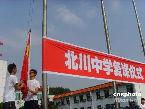 復課儀式上,五星紅旗在同學們的國歌聲中冉冉升起,降半旗向地震遇難者致哀。同學們重新返回課堂,用堅強的意志備戰(zhàn)高考。中新社發(fā) 霍潺 攝