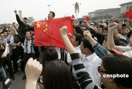 2008年5月19日14時31分,默哀結束后,在北京天安門廣場的近萬名民眾仍然聚集在一起,手持國旗和菊花,高喊:“加油四川!加油中國!”中新社發(fā) 李剛 攝