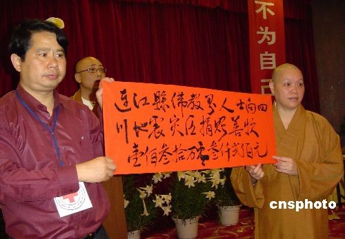 五月二十日上午,由福建省連江縣佛教協(xié)會主辦的“向四川地震災區(qū)捐款的愛心募捐活動”,在連江縣城舉行,三千余名連江縣佛教四眾弟子踴躍捐款獻愛心,共募集捐款一百三十多萬元人民幣。圖為連江縣佛教協(xié)會會長界渡法師,將一百三十多萬元善款轉交連江縣紅十字會匯往四川災區(qū)。