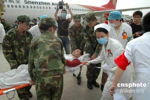 5月22日15時40分,深圳航空公司一架波音737飛機準時將38名四川災區(qū)傷員運抵南寧國際機場。大批早已集結在此的醫(yī)護人員迅速將傷員轉運至南寧各大醫(yī)院。當天將有4架飛機共144名傷員運至南寧,這些在地震中經歷了生死瞬間的四川同胞,將分別被安排在廣西醫(yī)科大學第一附屬醫(yī)院等四個醫(yī)院進行后續(xù)治療。中新社發(fā) 蔣雪林 攝