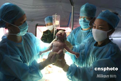 5月23日上午9時(shí)28分,在四川綿陽(yáng)平武縣南壩鎮(zhèn)濟(jì)南軍區(qū)醫(yī)療救護(hù)站的軍醫(yī)為水觀鄉(xiāng)大溝村29歲的婦女賈鳳平順利接生了一個(gè)七個(gè)月大的早產(chǎn)女嬰。父親蘇德奎為孩子起名叫“蘇震生”。 中新社發(fā) 畢華明 攝
