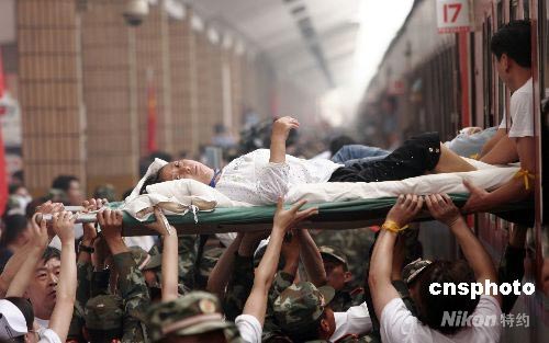 5月24日,運載四川綿陽到武漢漢口的264名地震災(zāi)區(qū)傷員轉(zhuǎn)運專列到達漢口站。他們將在協(xié)和、同濟、陸軍總醫(yī)院、人民醫(yī)院等醫(yī)院接受治療。中新社發(fā) 攝記 攝