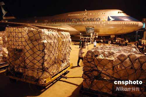 滿載各類救災(zāi)物資、從美國起飛的一架波音七四七貨運(yùn)專機(jī),于24日晚11時(shí)50分飛抵成都雙流國際機(jī)場。這架由美國著名慈善機(jī)構(gòu)撒瑪利亞救援會包租的專機(jī),是截至目前政府渠道之外運(yùn)送救災(zāi)物資到四川災(zāi)區(qū)的首架國外民間包機(jī)。中新社發(fā) 陳文 攝