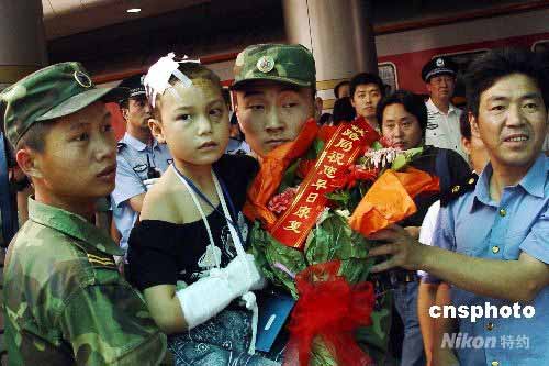 五月二十五日,一名來自四川廣元的小傷員被兩軍解放軍戰(zhàn)士抱起。當日上午十一時零三分,滿載著二百七十二名汶川大地震受傷人員的廣元至鄭州“運送災區(qū)受傷親人”專列抵達鄭州火車站,他們將在當?shù)鼐偶抑付ㄡt(yī)院接受治療。中新社發(fā) 李志全 攝