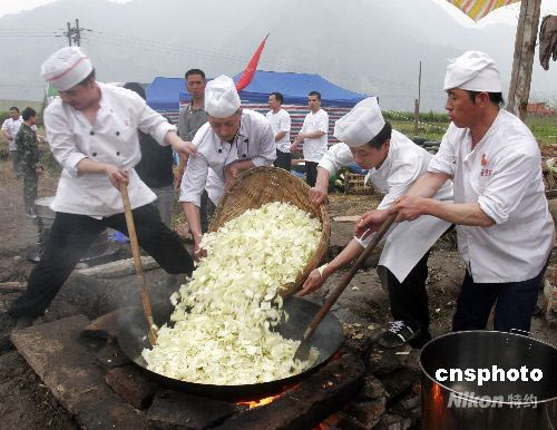 2008年5月25日下午6時,四川彭州市小魚洞鎮(zhèn)大南村田地上,來自北京的大廚們在為當(dāng)?shù)卮迕褡觥百c災(zāi)飯”。24日開始,北京美食聯(lián)盟組織北京全聚德、大鴨梨、便宜坊等大飯店的105名廚師,籌集200萬元資金在災(zāi)區(qū)分設(shè)3個賑災(zāi)點(diǎn),免費(fèi)為災(zāi)區(qū)群眾供應(yīng)飯菜。中新社發(fā) 張曉理 攝
