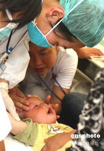 5月26日,由德國援助的“中德紅十字會野戰(zhàn)醫(yī)院”在四川大地震的重災區(qū)都江堰開始接待傷病員。該醫(yī)院由德國紅十字會緊急提供一個全套野戰(zhàn)醫(yī)院設備和11名醫(yī)療技術專家,由中國紅十字會組織上海華山醫(yī)院、四川相關醫(yī)院的醫(yī)務人員接診傷病員,野戰(zhàn)醫(yī)院由手術室、產房、急診室、放射室、實驗室和藥房組成。圖為一名在地震中幸運脫險的半周歲男童,由于多日在防震棚中生活染上不適癥并發(fā)生呼吸緊迫癥后被緊急送到該醫(yī)院搶救。中新社發(fā) 任晨鳴 攝