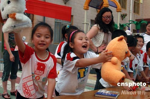 5月28日上午,河南油田五一社區(qū)黃山幼兒園開展“油城飄起黃絲帶,師幼愛心獻(xiàn)災(zāi)區(qū)”義賣捐款活動(dòng)。200多名小朋友把自己平時(shí)喜愛的玩具、課外書等拿出來義賣,在園內(nèi)擺起一個(gè)個(gè)“愛心”小攤。幼兒園將義賣款項(xiàng)做為孩子們“六一”兒童節(jié)的愛心禮物,捐獻(xiàn)給四川災(zāi)區(qū)的小朋友。中新社發(fā) 李永哲 攝